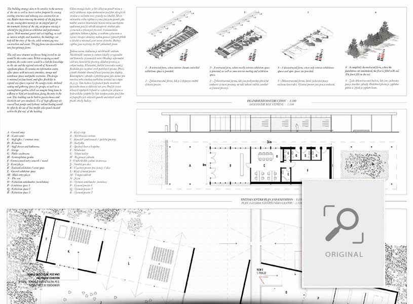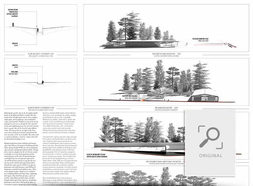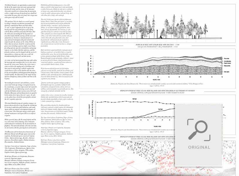 A scar cuts through the land, physical manifestation of the trauma and buried history of the Roma and Sinti. Beyond the cultural center, the scar leads visitors from Lipes Pond, through layers of history, to the walls of the camp, where it digs down to enter. Much like death was imminent for many detained in the camp during the holocaust, being directed towards the burial is the only way forward for those visiting the camp. Fragments of memory in the forest lead visitors to the burial ground.
