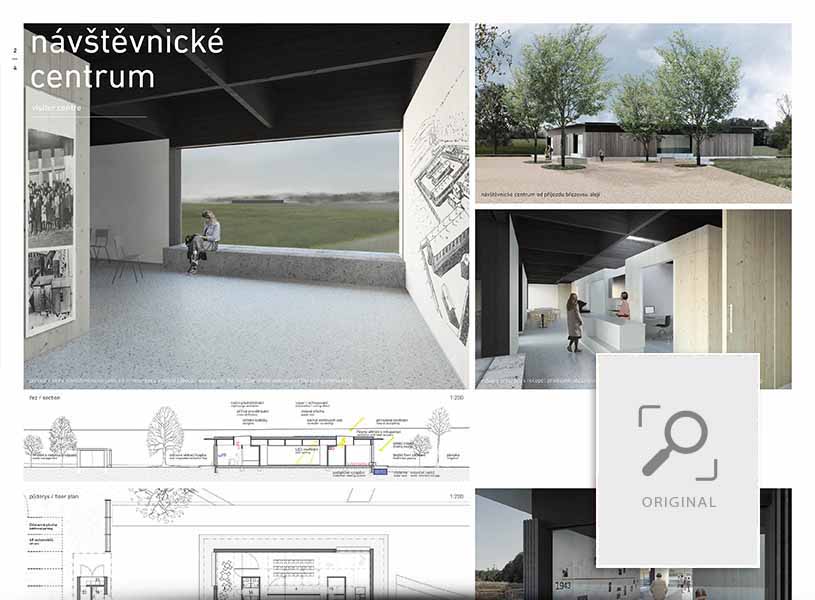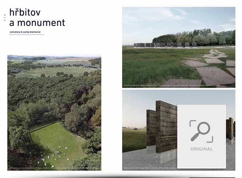 Martin Duba, Petr Šindelář, Tereza Havránková Collaborating persons : Milada Vorzová, Alice Boušková, Daniela Fenclová Annotation The memorial site is based on developing three main axes already present in the countryside. The three intersecting lines mirror three conceptual timelines – present, past and future – which form the frame of the memorial narrative. Each line is connected with one of three objects and therefore defines its meaning in the whole composition: the visitor centre is a place of present times, facts and discussion; the cemetery is an authentic place of troubled history and an undeniable proof of holocaust; the camp monument is a place of reconciliation, which should connect our positive ideas of the shared future. |